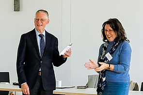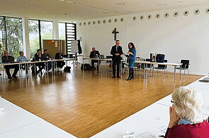 Am Nachmittag war Prof. Dr. Johanna Rahner von der Eberhard Karls Universität Tübingen zu Gast. Sie hielt ein Vortrag zum Thema. Welche Innovation braucht die Ökumene? Theologische Zeitansagen mit Blick auf Kirchen und Gesellschaft. In einem ersten Teil hat sie die Ergebnisse der Kirchenmitgliedschaft Untersuchung (KMU6) dargestellt und deutlich gemacht, dass beide großen Kirchen mit hohen Mitgliederverlusten auch in Zukunft rechnen müssen und welche Herausforderungen diese verringerte Zahl auch für die Ökumene mit sich bringt. Sie stellte die etwas provokante Frage, ob wir in Zukunft lieber eine in uns abgeschlossene, kleine Herde sein wollen, oder auch als kleine Gemeinschaften Sauerteig für die Gesellschaft sein wollen. Sie selbst plädiert ausdrücklich für die Sauerteigtheorie und empfiehlt den großen und auch den kleinen Kirchen, dass sie sich Partnerinnen und Partner in der Gesellschaft suchen sollen. Denn die Kirchen müssen raus in die Welt gehen, dahin, wo die Menschen leben und sich im Alltag bewähren müssen. So können sie auch heute die christliche Rede von der Menschwerdung Gottes Wirklichkeit werden lassen. Ihr Auftrag ist es sich in Wort und Tat für die Würde jedes Menschen stark zu machen - Räume und Orte für Dialog und Begegnung zu schaffen. Die Kirchen können selbstbewusst in die Zukunft gehen. Die Untersuchungen des Religionsmonitors belegen, „dass Religion, als gelebte religiöse Praxis, die mit einer Gemeindeanbindung einhergeht, gesellschaftliche Solidarität stärken kann. Wer auf solche Weise religiös ist, zeigt ein höheres Solidaritätsverhalten und ist zuversichtlicher hinsichtlich der Potenziale unserer Gesellschaft.